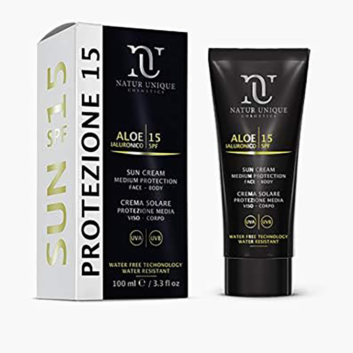 Ricca Crema Solare Protettiva con protezione media 15 SPF con tecnologia Water free, nuova tecnologia senz'acqua, in cui la fase acquosa è interamente composta da Gel di succo d'Aloe e rappresenta il 72% dell'intera formula.