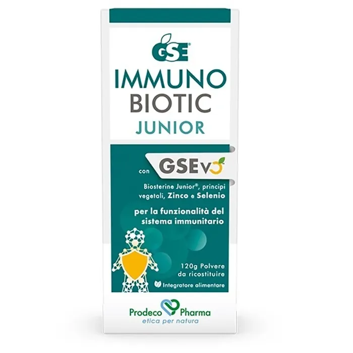 GSE IMMUNOBIOTIC JUNIOR è un integratore alimentare a base di Estratto di semi di Pompelmo (GSEvo®), Biosterine Junior® (fitocomposto costituito da Menta spicata e Melissa officinale, titolato al 40% in Acido rosmarinico), Uncaria, Ananas, Zinco e Selenio. I componenti di GSEvo® svolgono un’azione antiossidante e possono contribuire all’equilibrio microbico dell’organismo. L’Uncaria favorisce le naturali difese immunitarie. La Menta promuove il benessere di naso e gola. La Melissa svolge un effetto antiossidante, inoltre favorisce il normale tono dell’umore e il rilassamento. Lo Zinco e il Selenio contribuiscono alla normale funzione del sistema immunitario e proteggono le cellule dallo stress ossidativo.